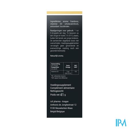 D-ixX liquid bevat per druppel 200 IE of 5 µg natuurlijk vitamine D3 (uit schapenwolvet), opgelost in middellange vetzuurketens (uit kokosolie) voor een goede opname en heeft een aangename, natuurlijke frambozensmaak.