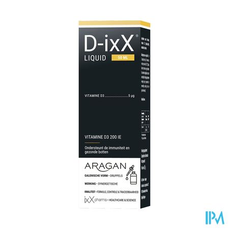 D-ixx Liquid Druppels 50ml is een voedingssupplement, verkrijgbaar in uw buurtapotheek of online apotheek. Neem niet meer dan de aanbevolen dagelijkse dosis vermeld op de verpakking. Het vervangt geen gezonde levensstijl en gevarieerde en evenwichtige voeding. Vraag raad aan uw apotheker. Het product altijd buiten het bereik van kinderen houden.