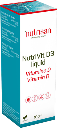 Nutrivit D3 Liquid 100ml Nutrisan is een voedingssupplement, verkrijgbaar in uw buurtapotheek of online apotheek. Neem niet meer dan de aanbevolen dagelijkse dosis vermeld op de verpakking. Het vervangt geen gezonde levensstijl en gevarieerde en evenwichtige voeding. Vraag raad aan uw apotheker. Het product altijd buiten het bereik van kinderen houden.