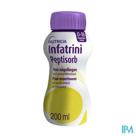 Infatrini Peptisorb is een energierijke, voedingskundig volledige, kant-en-klare dieetvoeding voor zuigelingen met groeiachterstand, verhoogde energiebehoefte en/of vochtrestrictie en tolerantieproblemen. Het is geschikt voor zuigelingen vanaf de geboorte en jonge kinderen tot de leeftijd van 18 maanden of een gewicht van 9kg. Infatrini Peptisorb is op basis van intensief gehydrolyseerd eiwit.