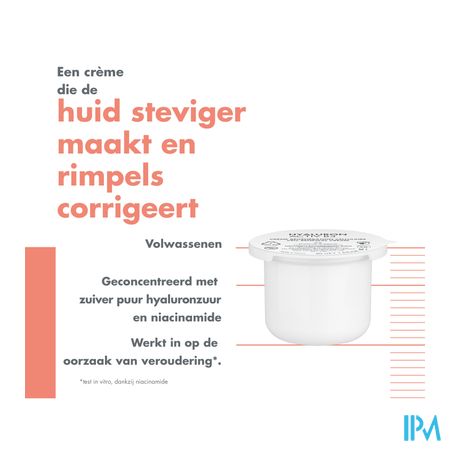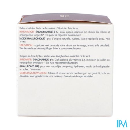 De celvernieuwende crème bevat een hoge concentratie aan hyaluronzuur en niacinamide, twee stoffen die de cellen stimuleren en hun levensduur verlengen*. De huid wordt geregenereerd: ze voelt steviger aan, straalt meer en heeft minder rimpels. De fluweelzachte textuur voelt aangenaam aan op de huid. Getest op alle huidtypes, zelfs gevoelige. Formule met 92 % ingrediënten van natuurlijke oorsprong. Navulbaar potje.