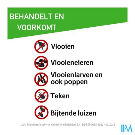 tegen nieuwe infestaties met volwassen vlooien houdt gedurende 8 weken aan. Preventie van de