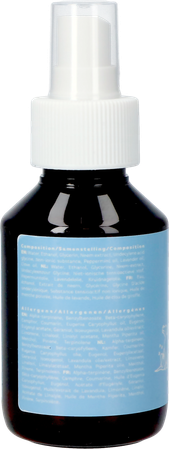 Water, Ethanol, Glycerine, Neem-extract, Undecyleenzuur Glycine, Niet-ionische tensioactieve stof, Pepermuntolie, Lavendelolie, Kruidnagelolie.