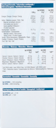 Bij een dubbele dosering (2 zakjes in 500ml water = 6d ORS) ontstaat er een typische "Oral Rehydration Solution (=ORS)". De 6d HYDRO/ORS in deze concentratie bevat 7,5g glucose onder de vorm van maltodextrine, en 900 mg natrium per bidon van 500ml. De combinatie van natrium en glucose in een hypotone oplossing (±210 mmol/kg) maximaliseert de vochtopname ter hoogte van de dunne darm. De 6d ORS is dus de ideale oplossing voor sporters die heel veel zweten en bovendien veel zout verliezen. Ook gedurende een langdurig verblijf in een warme en vochtige omgeving (= tropisch klimaat) is de dubbele dosering vaak aangewezen om een optimale vocht- en elektrolytenbalans te behouden. Bovendien is de 6d ORS dankzij zijn hoog zoutgehalte de meest ideale drank om in voorbereiding op een inspanning het lichaam te "pre-hydrateren" en na de inspanning te "re-hydateren". Dit doet zich vooral voor na lange trainingen of wedstrijden waarbij vocht- en zoutverliezen aanzienlijk oplopen en er na de inspanning heel veel gedronken moet worden om de vochtbalans te kunnen herstellen. Tijdens duurinspanningen in een warme en vochtige omgeving wordt standaard de 6d ISOTONIC SPORTS DRINK aanbevolen die naast 30g koolhydraten ook 450 mg natrium bevat per 500ml bidon. Toch kan het voor sommige sporters wenselijk zijn om tijdens lange duurinspanningen (>3 uur) extra zout in te nemen via de 6d ORS.