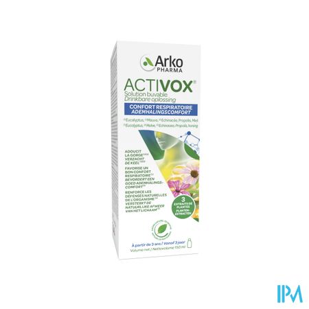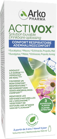 Activox® drinkbare oplossing wordt aanbevolen om de neus, keel en bovenste luchtwegen te verzachten. Met een goede natuurlijke muntsmaak, biedt het een formule op basis van 3 plantenextracten, honing en propolis.