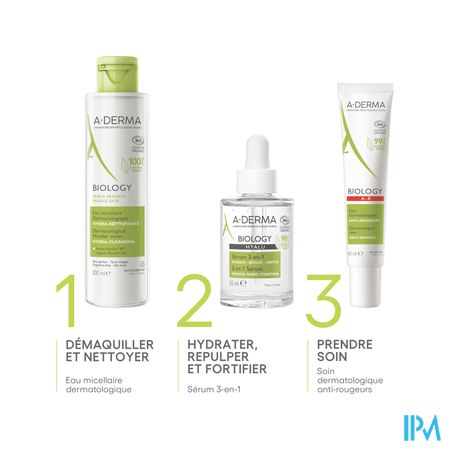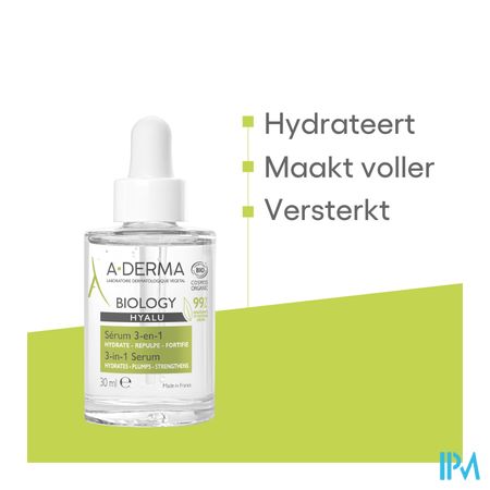 3-In-1 serum is een unieke en innoverende gezichtsverzorging, zowel dermatologisch als biologisch gecertificeerd. De frisse gel zonder plakkerige textuur hydrateert in slechts 1 minuut¹, geeft de kwetsbare huid van het gezicht volume en maakt het steviger dankzij krachtige actieve bestanddelen: ORGANISCH Rhealba® Haversap met herstellende en hydraterende eigenschappen, paardenbloemextract bekend om zijn anti-vervuilende eigenschappen en hyaluronzuur voor een langdurige hydratatie. De formule is getest op de allergische huid, bevat geen parfum en essentiële oliën en is niet-comedogeen. De formule is voor 99% biologisch gecertificeerd en van natuurlijke oorsprong en bevat alleen de essentiële ingrediënten voor een optimale tolerantie, met de grootst mogelijke zorg voor de kwetsbare huid. Afhankelijk van de behoeften van uw huid kan het 3-in-1 BIOLOGY HYALU serum met uw dagcrème worden gemengd voor een verzorging op maat voor gezicht, hals en ogen. De perfect gehydrateerde en beschermde huid voelt meteen na het aanbrengen soepeler en voller aan en de teint straalt. Rhealba® Haver, afkomstig uit de biologische landbouw. Vegan Info: geen ingrediënten van dierlijke oorsprong.