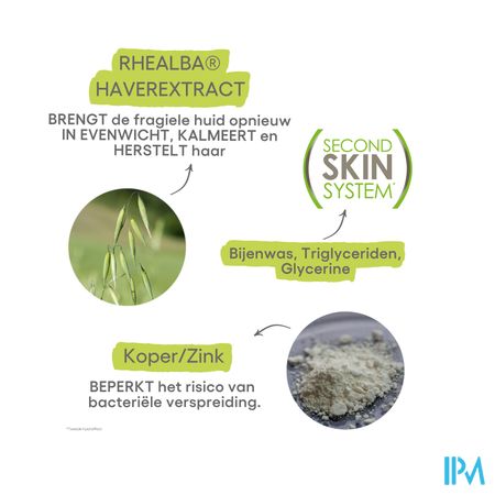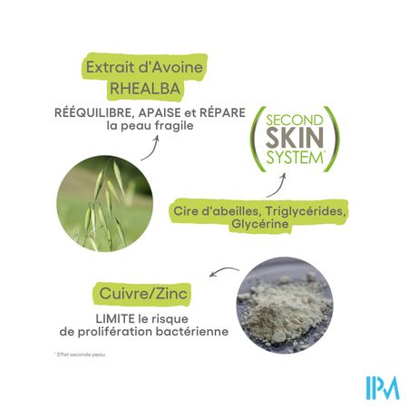 Deze barrièrecrème isoleert en beschermt de huid (lichaam, gelaat, handen en externe intieme zones) dankzij de formule die bestaat uit een complex van natuurlijke actieve bestanddelen: " Tweede Huid Systeem"*. Een "tweede huid"-effect dat isoleert en beschermt tegen mogelijke oorzaken van irritatie van de huidbarrière: koude, water, wrijving, chemicaliën, detergenten en contact met irriterende metalen in de professionele of huiselijke sfeer. De hoogtolerante formule met Rhealba® haverplantextract verzacht de fragiele huid, terwijl koper en zink het risico van bacteriële verspreiding beperken. De beschermende crème weerstaat tot vijf keer zwemmen (in zoet, zout of chloorwater).