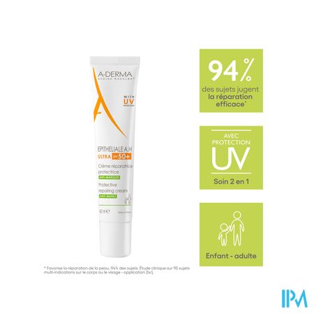 De EPITHELIALE A.H ULTRA SPF50+ 2-in-1 verzorging versnelt het herstel* van de fragiele huid en biedt een zeer hoge zonnebescherming van SPF 50+ met een dubbele werking tegen bruine en rode vlekjes. De formule bevat een gepatenteerd herstellend complex tegen vlekken van 3 actieve ingrediënten genaamd Cicahyalumide® (dipeptide, hyaluronzuur en Rhealba® Haverplantextract) en Peruaanse liaan om ongemakken van de huid te verzachten. Voor een hoge tolerantie bevat het een fotobeschermend systeem met slechts 4 filters in een geoptimaliseerde concentratie die op het huidoppervlak blijven, zelfs als deze gefragiliseerd is. Het is niet geparfumeerd en geschikt voor zowel kinderen als volwassenen. Het kan regelmatig op het gezicht en lichaam worden aangebracht.* Bevordert het herstel van de épidermis. Rhealba® Haver van biologische landbouw. Vegan info: zonder ingrediënten van dierlijke oorsprong