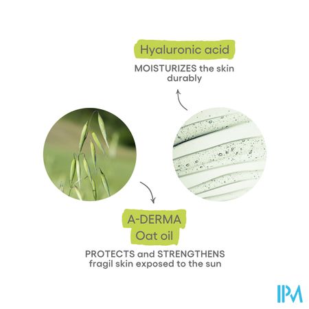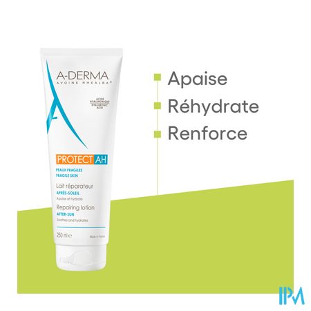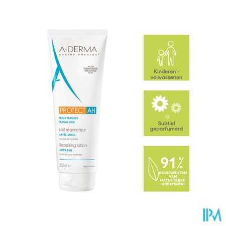 Deze herstellende aftersunmelk biedt de fragiele, gevoelige huid van het hele gezin een hydraterende aftersunmelk die speciaal is samengesteld om aan hun behoeften te voldoen. De innoverende samenstelling rehydrateert en kalmeert onmiddellijk de verhitte huid. Door de combinatie van twee essentiële actieve bestanddelen, hyaluronzuur (hydraterend bestanddeel) en Rhealba® haverkiemolie, bevordert A-DERMA PROTECT AH Hydraterende Herstellende Aftersun Melk het herstel van de epidermis. Hyaluronzuur gaat het vochtverlies door blootstelling aan de zon tegen en Rhealba® Haverkiemolie gaat de vertraagde oxidatieve effecten tegen (want zelfs na blootstelling blijven de cellulaire aanvallen aanhouden). Deze licht geparfumeerde en ultrafrisse melk kan zowel op het gezicht als op het lichaam worden aangebracht dankzij de frisse en lichte formule die voor 91% uit ingrediënten van natuurlijke oorsprong bestaat. De tere, gevoelige huid wordt gekalmeerd, gehydrateerd en beschermd. Rhealba® haver van biologische teelt. Vegan Info: zonder ingrediënten van dierlijke oorsprong