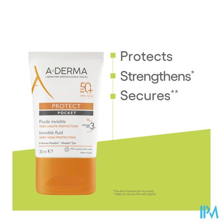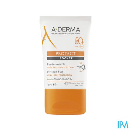 Altijd bij de hand, A-DERMA PROTECT POCKET - SPF 50+ beschermt de fragiele gemengde tot vette huid tegen de zon en vervuiling. Dankzij zijn praktische pocketformaat kunt u hem overal mee naartoe nemen (stad, openlucht...), ongeacht uw activiteit (sport of ontspanning). Het duo van poeders, geïntegreerd in de formule, absorbeert onmiddellijk talg van het huidoppervlak. De "Instant Dry 3 seconds" technologie ("onmiddellijk droog" in drie seconden) laat geen witte vlekken of vettige film achter op de huid. PROTECT POCKET Onzichtbare Zonnefluide Gezicht SPF50+ is waterbestedig, versterkt en beschermt de fragiele huid tegen schade veroorzaakt door de zon, met name dankzij Barriestolide® van Rhealba® haverkiemolie. Een gepatenteerde* zonnebeschermingsinnovatie die het resultaat is van zeven jaar onderzoek. Dankzij de strenge selectie en de geoptimaliseerde concentratie van filters en ingrediënten is dit het beste antwoord op de behoefte aan dagelijkse bescherming tegen de zon. Al onze filters zijn geëvalueerd door onafhankelijke laboratoria, die hebben aangetoond dat onze A-DERMA PROTECT-filters geen invloed hebben op organismen die representatief zijn voor het zeemilieu, met name koralen (zie hieronder - rubriek 'Ecologisch verantwoorde filters'). Rhealba® Haver van biologische teelt. Vegan Info: zonder dierlijke ingrediënten. Tube van gerecycleerd plastiek * Patent aangevraagd