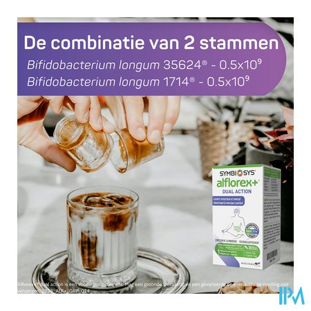 Elke capsule alflorex+® dual action bevat 1 miljard KVE*: 0.5x10⁹ Bifidobacterium longum 35624® en 0.5x10⁹ Bifidobacterium longum 1714™ aangevuld met Calcium (120 mg), vitamine B5 (6 mg) en B6 (1.4 mg).