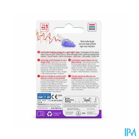 Voor het slapen gaan doe je de oordoppen in je gehoorgang. Trek uw oorschelp lichtjes omhoog en plaats de oordop met uw andere hand in het oor tot de oordop goed aansluit. Uitnemen is extra makkelijk door het zachte uitneemlipje. Plaats de oordop niet te diep in het oor. Onjuiste passing, onjuist gebruik of het niet volgen van de instructies in de gebruiksaanwijzing beperkt de effectiviteit van de geluidsreductie, vergroot de kans op gehoorschade en bekort de levensduur van de herbruikbare oordoppen.