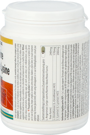 Ingrediënten: L-Arginine; L-Lysine HCl; L-Ornithine HCl; hydroxypropylmethylcellulose (capsule); glijmiddel: magnesium stearat.