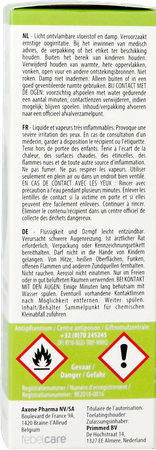- De vloeistof tast bepaalde materialen aan. Vermijd daarom contact met kunststoffen (o.a. brilmonturen), synthetische/lederen kleding en gelakte oppervlakken (o.a. tafelbladen).