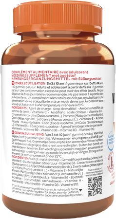 Vulstof: maltitolstroop - Gemodificeerd aardappelzetmeel - Vitamine C - Zuurmiddel: citroenzuur - Vitamine B3 - Concentraten van wortel (Daucus carota L.), appel (Malus domestica Borkh.), zwarte bes (Ribes nigrum L.) en kers (Prunus cerasus L.) - Vitamine E - Natuurlijke aroma's - Plantaardige oliën: kokosnoot (Cocos nucifera L.) en koolzaad (Brassica napus L.) - Vitamine B6 - Zoetstof: sucralose - Glazuur. ) - Vitamine E - Natuurlijke aroma's - Plantaardige oliën: kokosnoot (Cocos nucifera L.) en koolzaad (Brassica napus L.) - Vitamine B6 - Zoetstof: sucralose - Glansmiddel: carnaubawas - Vitamine A - Vitamine B9 - Vitamine B8 - Vitamine D3 - Vitamine B12.