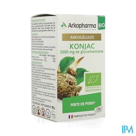 Arkocaps Konjac Bio Caps 150 Nf is een voedingssupplement, verkrijgbaar in uw buurtapotheek of online apotheek. Neem niet meer dan de aanbevolen dagelijkse dosis vermeld op de verpakking. Het vervangt geen gezonde levensstijl en gevarieerde en evenwichtige voeding. Vraag raad aan uw apotheker. Het product altijd buiten het bereik van kinderen houden.