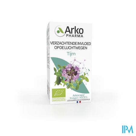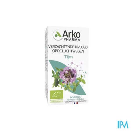 Arkocaps Tijm Bio Caps 45 Nf is een voedingssupplement, verkrijgbaar in uw buurtapotheek of online apotheek. Neem niet meer dan de aanbevolen dagelijkse dosis vermeld op de verpakking. Het vervangt geen gezonde levensstijl en gevarieerde en evenwichtige voeding. Vraag raad aan uw apotheker. Het product altijd buiten het bereik van kinderen houden.