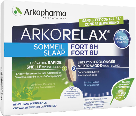 Arkorelax® Slaap Fort 8U is een voedingssupplement op basis van Melatonine, Plantenextracten en Vitamine B6. ARKORELAX® SLAAP FORT 8U garandeert u een volledige nacht dankzij zijn innovatieve formule aan melatonine met snelle en vertraagde vrijstelling en hoog geconcentreerd aan extracten van planten die gekend zijn voor hun eigenschappen op de slaap. Dit product veroorzaakt geen enkele bijwerking en geen slaperigheid bij het ontwaken.