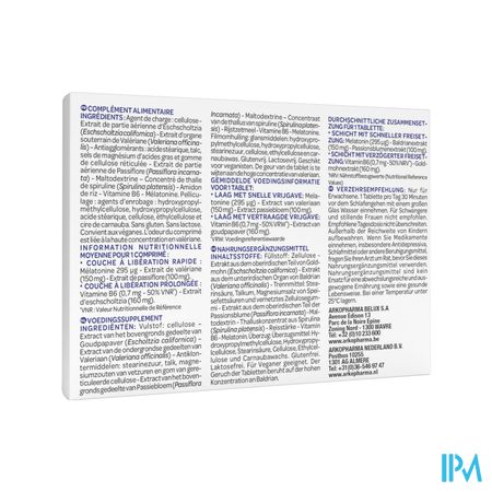 Vulstof: cellulose - Extract van het bovengronds gedeelte van Goudpapaver (Elscholtzia californica Cham.) - Extract van de ondergrondse gedeelten van Valeriaan (Valeriana officinalis L.) - Antiklontermiddelen: stearinezuur, talk, magnesiumstearaat en gom van gereticuleerde cellulose - Extract van het bovengronds gedeelte van de Passiebloem (Passiflora Incarnata L.) - Maltodextrine - Concentraat van de thallus van spiruline (Spirulina platensis (Gomont) Geitler) - Rijstzetmeel - Vitamine B6 - Melatonine.