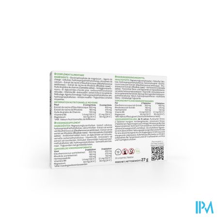 INGREDIËNTEN: Magnesiumglycerofosfaat - Vulstof : cellulose, hydroxypropylmethylcellulose, calciumfosfaat - Extract van wortel van Eleutherococcus (Eleutherococcus senticosus) - Extract van de wortel van Rhodiola (Rhodiola rosea) - Hennepzaadolie (Cannabis sativa) -Antiklontermiddel: mono- en diglyceriden van vetzuren, vernette carbomethylcellulose - Vitamine B6 - Antioxidant: rijk extract van tocoferolen. Omhulsel: Glansmiddel: hydroxypropylmethylcellulose, talk, hydroxypropylcellulose - Gemodifi ceerd zetmeel - Triglyceriden met gemiddelde keten.