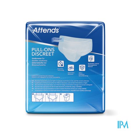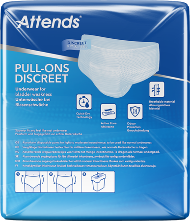Attends Pull-Ons Discreet Underwear 3 Large zijn discrete en comfortabele, absorberende broekjes met een superieure pasvorm. De broekjes zijn gemaakt van zijdezacht materiaal, voelen aan als normaal ondergoed en kunnen eenvoudig aan- en uitgetrokken worden. Ontwikkeld voor de gevoelige huid en ontworpen voor mannen en vrouwen met licht tot matig urineverlies..