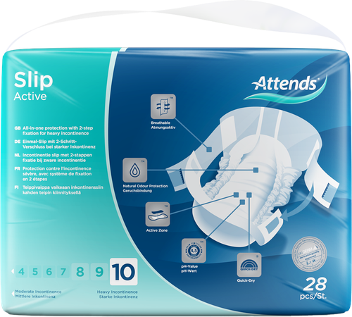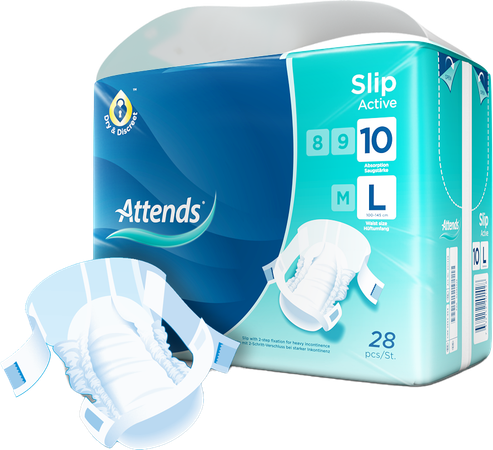 Attends Slip Active is ontworpen voor de gebruiker die een actief leven leiden en toch behoefte hebben aan een optimaal beschermend product bij zware incontinentie. Door de speciale fixatie en pasvorm is het product nauwelijks waarneembaar onder normale kleding doordat de slip perfect aansluit op het lichaam.