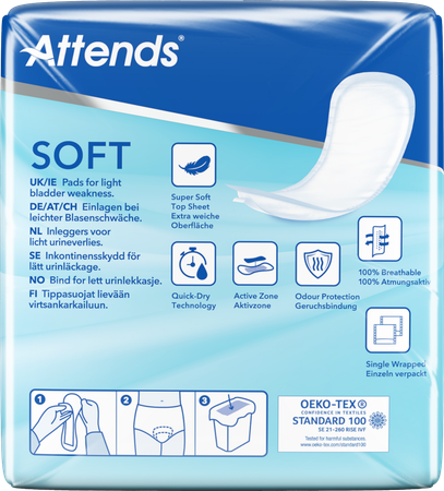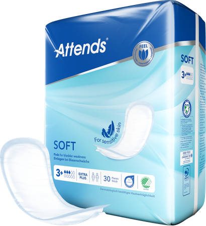 Attends Soft 3+ Extra Plus zijn discrete, absorberende inleggers voor licht urineverlies. Speciaal ontwikkeld voor de gevoelige huid. Extra Lang.