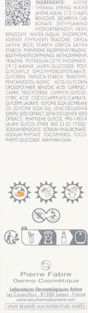 AVENE THERMAL SPRING WATER (AVENE AQUA). C12-15 ALKYL BENZOATE. DICAPRYLYL CARBONATE. DIETHYLAMINO HYDROXYBENZOYL HEXYL BENZOATE. WATER (AQUA). DIISOPROPYL ADIPATE. ETHYLHEXYL TRIAZONE. ORYZA SATIVA (RICE) STARCH (ORYZA SATIVA STARCH). PHENYLENE BIS-DIPHENYLTRIAZINE. BIS-ETHYLHEXYLOXYPHENOL METHOXYPHENYL TRIAZINE. POTASSIUM CETYL PHOSPHATE. C9-12 ALKANE. LAURYL GLUCOSIDE. POLYGLYCERYL-2 DIPOLYHYDROXYSTEARATE. GLYCERIN. TAPIOCA STARCH. TRIMETHYLPENTANEDIOL/ADIPIC ACID/GLYCERIN CROSSPOLYMER. BENZOIC ACID. CAPRYLIC/CAPRIC TRIGLYCERIDE. CAPRYLYL GLYCOL. CITRIC ACID. COCO-CAPRYLATE/CAPRATE. GLYCERYL LAURATE. GLYCINE SOJA (SOYBEAN) OIL (GLYCINE SOJA OIL). LENS ESCULENTA (LENTIL) SEED EXTRACT (LENS ESCULENTA SEED EXTRACT). PENTYLENE GLYCOL. PPG-1-PEG-9 LAURYL GLYCOL ETHER. RED 33 (CI 17200). SODIUM BENZOATE. SODIUM HYALURONATE. SODIUM PHYTATE. TOCOPHEROL. TOCOPHERYL GLUCOSIDE. XANTHAN GUM