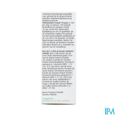 - De werkzame stoffen in dit middel zijn ethanolextracten van de Echinacea purpurea (Rode Zonnehoed) plant en wortel en van verse bladeren van Salvia officinalis (Salie).