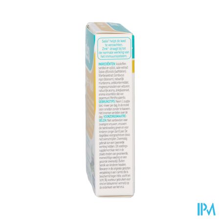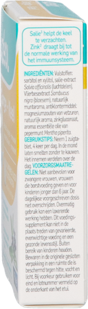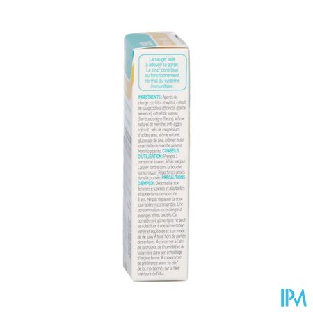 Vulstoffen: sorbitol en xylitol, Salvia officinalis-salie-extract (bladeren)1, Sambucus nigra-vlierbesextract (bloemen), natuurlijk muntaroma (etherische olie van pepermunt Mentha piperita (0,58 %)), antiklontermiddel: magnesiumstearaat, natuurlijk mentholaroma, zinkgluconaat, aroma: etherische olie van pepermunt Mentha piperita (0,36 %).