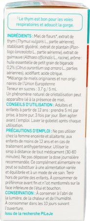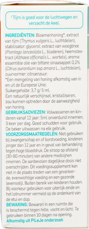Bloemenhoning*, tijm-extract (Thymus vulgaris L., bovengrondse delen), stabilisator: glycerol; weegbree-extract (Plantago lanceolata L., bovengrondse delen), heemst-extract (Althaea officinalis L., wortel), aroma: etherische olie van petit grain de bigarade 0,2% (Citrus aurantium ssp amara L., bovengrondse delen), zuurteregelaar: citroenzuur.