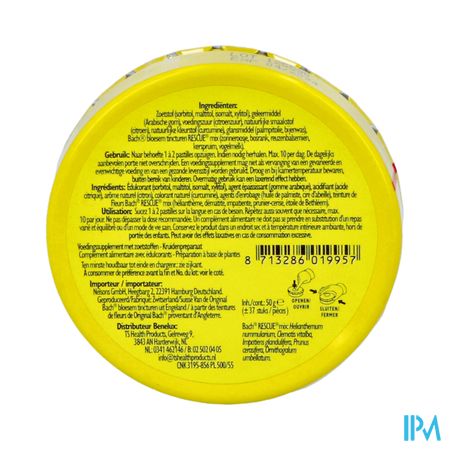 Zoetstoffen (sorbitol, maltitol, isomalt, xylitol), geleermiddel (Arabische gom), zuurteregelaar (citroenzuur), natuurlijke smaakstof (citroen), natuurlijke kleurstof (curcumine), glansmiddel (plantaardige olie, bijenwas), tinctuur van Rescue bloesemmix (zonneroosje, bosrank, reuzenbalsemien, kerspruim en vogelmelk), hulpstof tarwebloem.