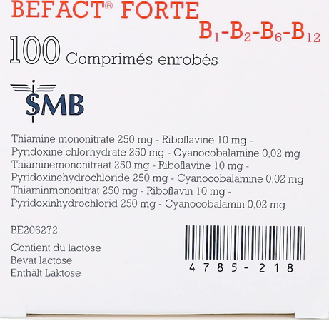 Actieve stoffen per tablet: Thiaminemononitraat 250 mg - Riboflavine 10 mg - Pyridoxinehydrochloride 250 mg - Cyanocobalamine 0,02 mg.