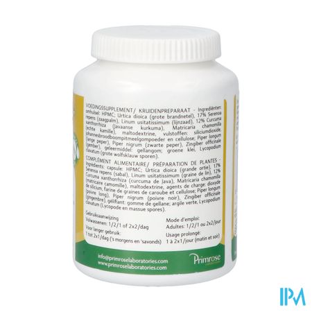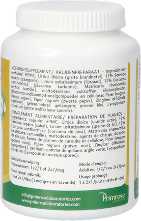 Wilde kamille, lijnzaad, zaagpalm, Javaanse geelwortel, grote brandnetel. Hulpstoffen: maltodextrine, colloïdaal siliciumdioxide, groene klei, johannesbroodpitmeelpoeder, Lycopodium clavatum (sporen van clubmos) en microkristallijne cellulose. Capsule omhulsel: hydroxypropylmethylcellulose.