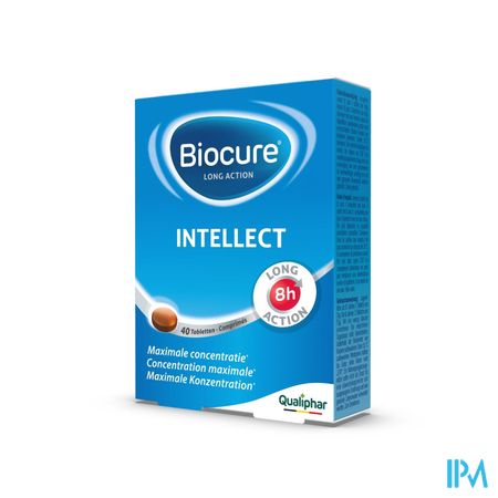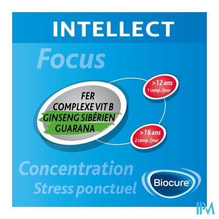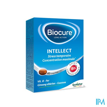 Biocure® Long Action Intellect bevat ijzer, twee belangrijke B-vitamines (B3 en B6), Siberische ginseng (Eleutherococcus senticosus) en guarana (Paulinia cupana). Een combinatie voor doorzetters. IJzer helpt bij het verminderen van vermoeidheid en ondersteunt een normale verstandelijke (cognitieve) functie, zoals geheugen en concentratie. Guarana is een plant die reeds bij de Indianen gekend was. Siberische ginseng is een adaptogeen. Adaptogenen zijn stoffen die het lichaam in evenwicht houden, zelfs onder stressvolle omstandigheden. Siberische ginseng werkt daarom als stressbuffer bij kortstondige stress. Vitamine B3 en B6 dragen bij tot het normaal functioneren van het zenuwstelsel. Biocure® Long Action Intellect is een Long Action formule. Dit wil zeggen dat alle actieve stoffen geleidelijk in het lichaam terechtkomen waar deze langzaam opgenomen worden. Deze unieke formule zorgt tegelijk voor een onmiddellijke werking. Biocure® Long Action Intellect werkt daarom snel, krachtig en langdurig. Biocure® Long Action Intellect bevat twee gestandaardiseerde planten: Siberische ginseng en guarana. Door standaardisering van planten wordt per dosering steeds dezelfde hoeveelheid plantenmateriaal toegediend. Dit ondersteunt de goede werking van Biocure® Long Action Intellect.