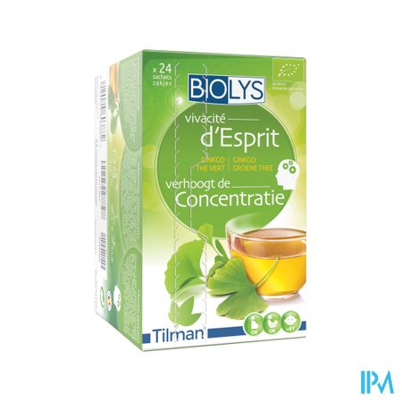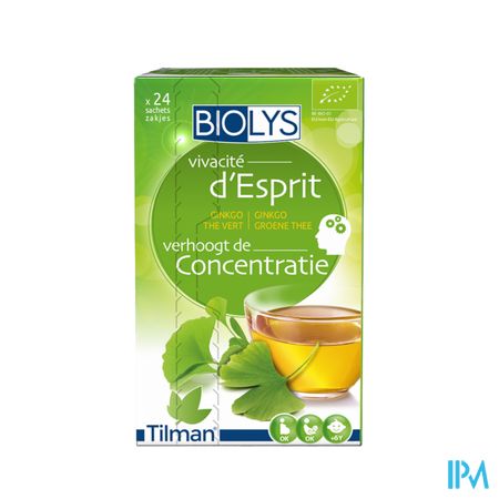 Biolys Ginkgo Groene Thee Sach 24 is een voedingssupplement, verkrijgbaar in uw buurtapotheek of online apotheek. Neem niet meer dan de aanbevolen dagelijkse dosis vermeld op de verpakking. Het vervangt geen gezonde levensstijl en gevarieerde en evenwichtige voeding. Vraag raad aan uw apotheker. Het product altijd buiten het bereik van kinderen houden.