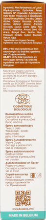 Exclusief voor uitwendig gebruik. Contact met de ogen, slijmvliezen of beschadigde huid mijden. Niet inslikken. De Biosolis zelfbruiner beschermt de huid niet tegen de schadelijke zonnestralen. Mijdt contact met kleren tot wanneer het product volledig in de huid is gedrongen. Niet uitsproeien op kleren. Buiten het bereik van kinderen houden. In geval van huidreactie, onderbreek het gebruik onmiddellijk en consulteer een arts.