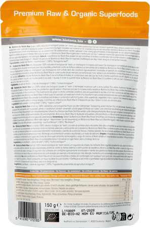 Biotona bio Reishi Raw is een 100% natuurlijk en biologisch poeder van reishi, een vlakke paddenstoel met een blinkend oppervlak. Deze eetbare paddenstoel wordt al duizenden jaren gebruikt in Aziatische landen als bescherming tegen invloeden van buitenaf en ter ondersteuning van de natuurlijke weerstand. Biotona bio Reishi Raw bevat het karakteristiek bittere vruchtlichaam van de paddenstoel. De paddenstoelen worden gekweekt onder streng gecontroleerde omstandigheden en zijn gegarandeerd vrij van toxische stoffen en zware metalen.