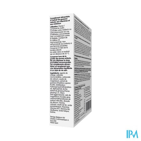 Vulstoffen: microkristallijne cellulose, calciumcarbonaat; magnesiumoxide (14 %); guarana-extract (Paullinia cupana) (8,5 %); stabilisator: hydroxypropylmethylcellulose; ijzerdifosfaat (3,2 %); ginseng-extract (Panax ginseng) (2,8 %); anti-klontermiddelen: magnesiumzouten van vetzuren, vernet natriumcarboxymethylcellulose, maltodextrine, siliciumdioxide; nicotinamide (1,1 %); kleurstof: ijzeroxide (rood), ijzeroxide (geel); pantotheenzuur (0,5 %); emulgator: mono- en diglyceriden van eetbare vetzuren; thiaminemononitraat (0,3 %); cyanocobalamine (0,2 %); pyridoxinehydrochloride (0,1 %); riboflavine (0,1 %); foliumzuur (0,01 %); biotine (0,003 %).