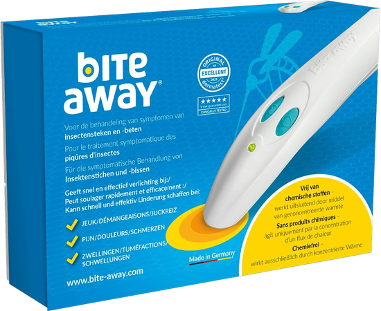 Bite away original is een apparaat dat door plaatselijke warmte steken en beten van muggen, wespen, bijen, brandnetels of kwallenbeten neutraliseert.
