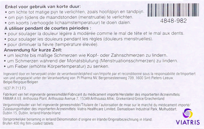 Volwassenen en adolescenten ouder dan 12 jaar (die minstens 40 kg wegen): Neem één tablet (400 mg) eenmaal per dag of hoogstens driemaal per dag in, met telkens 4 tot 6 uur tussen de innames. Het innemen van een dosis hoger dan 400 mg zorgt niet voor een beter pijnstillend effect. Neem in totaal niet meer dan 3 tabletten (1200 mg) per 24 uur in.