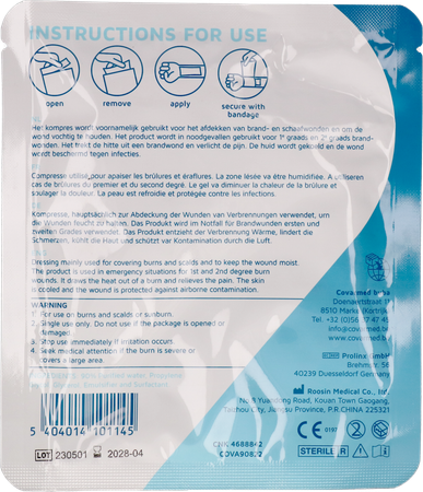 Het kompres wordt voornamelijk gebruikt voor het afdekken van brand- en schaafwonden en om de wond vochtig te houden. Het product wordt in noodgevallen gebruikt voor 1ste graads en 2de graads brandwonden. Het trekt de hitte uit een brandwond en verlicht de pijn. De huid wordt gekoeld en de wond wordt beschermd tegen infecties.