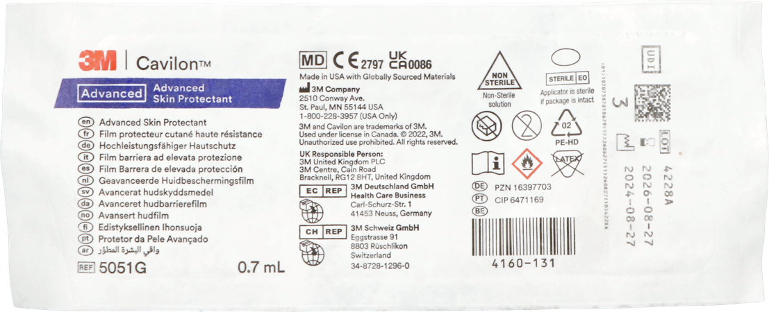 3M™ Cavilon™ Advanced is ontworpen om matige tot ernstige huidbeschadiging te beheren en de risicovolle huid te beschermen. De ultradunne, maar zeer duurzame barrière kan zich hechten aan natte, vochtige oppervlakken en een beschermende omgeving creëren die irriterende stoffen afstoot en genezing ondersteunt.