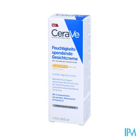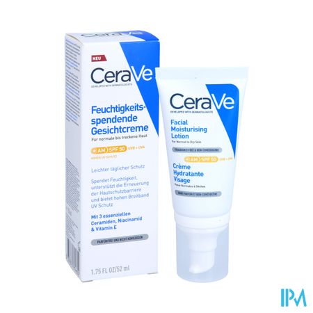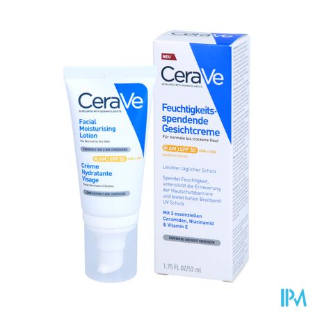 De hydraterende gezichtscrème met SPF50 van CeraVe is een veelzijdige dagcrème. Met drie essentiële ceramiden, hydraterend hyaluronzuur en verzachtende niacinamide maakt deze gezichtscrème ook gebruik van de gepatenteerde MVE technologie, om de huid gedurende de hele dag te voeden en te hydrateren. Deze gezichtscrème biedt ook een breedspectrum zonnebescherming aan met SPF50 en voorkomt aanhechting van vervuilende deeltjes. De gezichtscrème verdeelt zich homogeen over de huid, zonder witte strepen na te laten. Deze formule is niet-comedogeen, verstopt de poriën niet en is ideaal voor een normale tot droge huid en een zeer droge huid bij acne-behandeling.