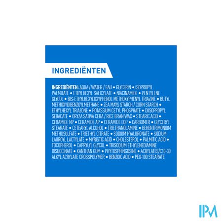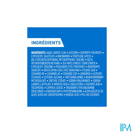 AQUA / WATER / EAU • GLYCERIN • ISOPROPYL PALMITATE • ETHYLHEXYL SALICYLATE • NIACINAMIDE • PENTYLENE GLYCOL • BIS-ETHYLHEXYLOXYPHENOL METHOXYPHENYL TRIAZINE • BUTYL METHOXYDIBENZOYLMETHANE • ZEA MAYS STARCH / CORN STARCH • ETHYLHEXYL TRIAZONE • POTASSIUM CETYL PHOSPHATE • DIISOPROPYL SEBACATE • ORYZA SATIVA CERA / RICE BRAN WAX • STEARIC ACID • CERAMIDE NP • CERAMIDE AP • CERAMIDE EOP • CARBOMER • GLYCERYL STEARATE • CETEARYL ALCOHOL • TRIETHANOLAMINE • BEHENTRIMONIUM METHOSULFATE • TRIETHYL CITRATE • SODIUM HYALURONATE • SODIUM LAUROYL LACTYLATE • MYRISTIC ACID • CHOLESTEROL • PALMITIC ACID • TOCOPHEROL • CAPRYLYL GLYCOL • TRISODIUM ETHYLENEDIAMINE DISUCCINATE • XANTHAN GUM • PHYTOSPHINGOSINE • ACRYLATES/C10-30 ALKYL ACRYLATE CROSSPOLYMER • BENZOIC ACID • PEG-100 STEARATE