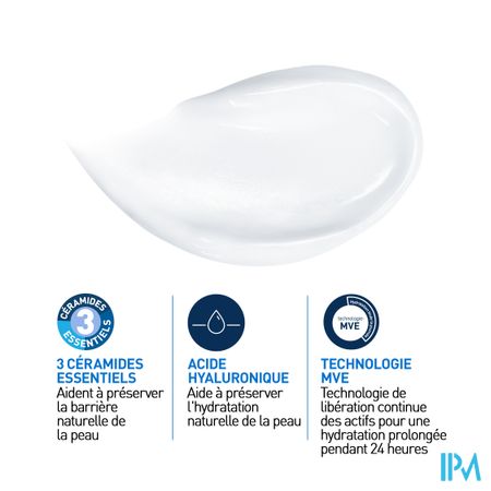 CeraVe Hydraterende Crème is een voedend verzorgingsproduct dat de natuurlijke huidbarrière beschermt en versterkt. Het is geschikt voor zowel een droge tot zeer droge huid als voor een huid met neiging tot eczeem of psoriasis. Het is verrijkt met de MVE-technologie, een gepatenteerd afgiftesysteem dat zorgt voor een continue vrijgave van actieve bestanddelen, waaronder hyaluronzuur en drie essentiële ceramiden. De natuurlijke huidbarrière wordt opnieuw in balans gebracht, en de huid wordt gedurende 24 uur gehydrateerd. De samenstelling uit hyaluronzuur en drie essentiële ceramiden zorgt enerzijds voor het behouden van een gehydrateerde huid, en anderzijds voor het herstellen van de natuurlijke huidbarrière. De crème trekt snel in de huid zonder irritaties te veroorzaken dankzij een rijke, niet-vette textuur. De formule is non-comedogeen, hypoallergeen en parfumvrij. Getest door dermatologen.