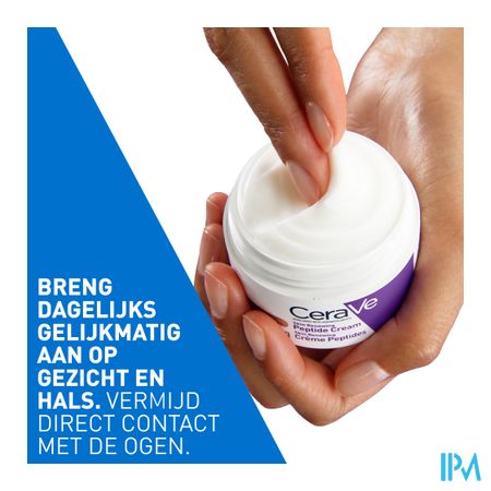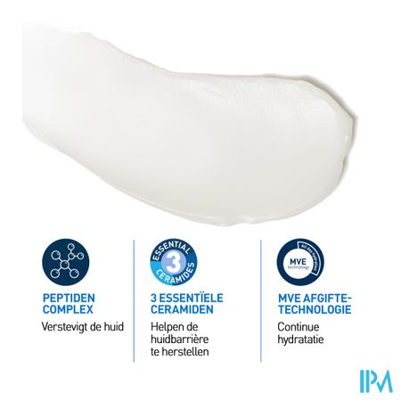 Het CeraVe Skin Renewing Peptide Crème is een milde maar effectieve crème geschikt voor alle huidtypes, inclusief een gevoelige huid. De formule met peptiden en 3 essentiële ceramiden helpt de stevigheid van de huid zichtbaar te verbeteren na 2 weken* en zorgt voor intense hydratatie tot 48 uur lang**. Het Peptide Complex helpt fijne lijntjes en rimpels te verminderen. De 3 essentiële ceramiden ondersteunen het herstel van de natuurlijke huidbarrière, terwijl de gepatenteerde MVE-technologie zorgt voor een geleidelijke afgifte van actieve ingrediënten voor een langdurige hydratatie. Het resultaat? Een stevigere en soepelere huid die gekalmeerd en gehydrateerd aanvoelt. *Gemiddeld resultaat van een klinische studie na 8 weken dagelijks gebruik. **instrumentele test, 24 personen
