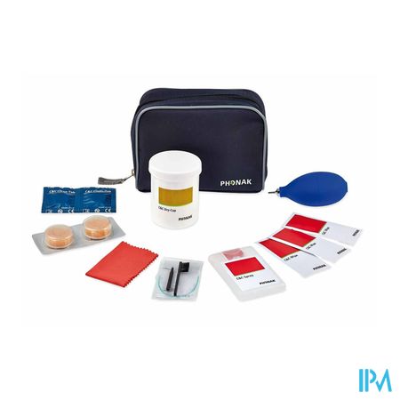 Een stijlvolle tas met rits met daarin de accessoires en gereedschappen die u nodig heeft voor het regelmatig reinigen en onderhouden van uw hoortoestellen om hun levensduur en prestaties te verbeteren.