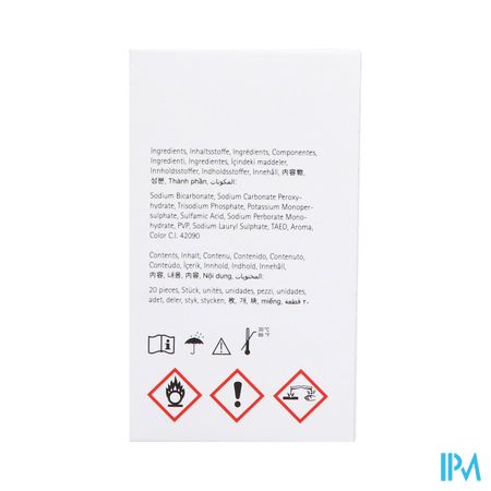 Ingrediënten: Sodium Bicarbonate, Sodium Carbonate Peroxyhydrate, Trisodium Phosphate, Potassium Monopersulphate, Sulfamic Acid, Sodium Perborate Monohydrate, PVP, Sodium Lauryl Sulphate, TAED, Aroma, Color C.I. 42090
