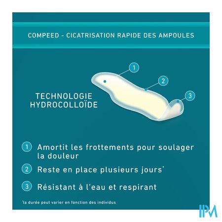 De blarenpleisters van Compeed® zorgen voor onmiddellijke pijnverlichting en een snelle genezing. Het gelkussentje verspreidt de druk op de blaar en neemt tegelijk de wrijving weg. De hydrocolloïdgel in de pleister neemt overtollig vocht op en zorgt voor de beste omstandigheden voor het herstel van de huid.